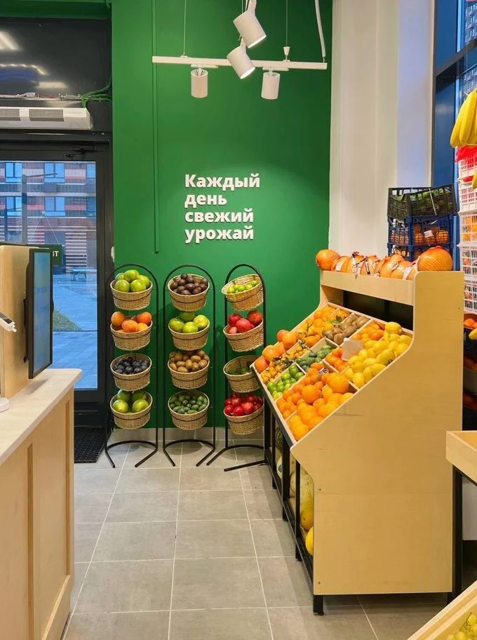По данным газеты «Коммерсантъ», площадь магазина составляет 70 квадратных метров. В ассортименте — фрукты, овощи, свежая зелень, салаты и замороженные продукты. Сотрудники могут на месте помыть товары, нарезать, приготовить соки, смузи и коктейли.