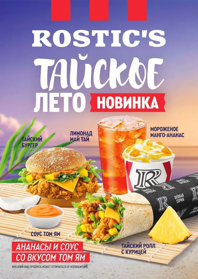 C 3 июня во всех ресторанах сети быстрого питания Rostic’s запустилась новая — тайская — линейка. В нее вошли бургер с кокосовой булочкой, кусочками ананаса и соусом том-ям, ролл с креветками или курицей в панировке, лимонад «Май Тай», милкшейк «Пина колада» и мороженое манго-ананас.