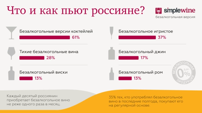 В России растет спрос на безалкогольные версии алкогольных напитков. Каждый десятый приобретает безалкогольное вино не реже одного раза в месяц, свидетельствуют результаты опроса SimpleWine, проведенного среди 5 тысяч респондентов старше 18 лет.