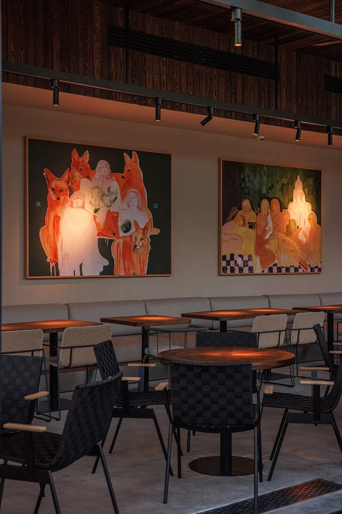 В зале ресторана есть 53 посадочных места, еще 127 — на веранде. Пообедать и поужинать можно как внутри, так и на лежаках. В меню: блюда европейской кухни с акцентом на рыбе, сезонных овощах и зелени.