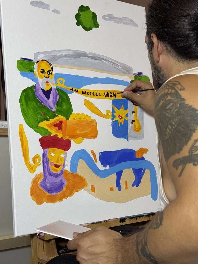 Он перемещается в пространстве, появляется в росписи, подслушивает, предупреждает, играет, взаимодействует с реальными фигурами и событиями истории города. Смотрит на Белелюбского, сидит под погостом княгини Ольги, разглядывает кирпичи, дразнит современников, повторяет за детьми, прячется за кустами, комментирует происходящее табличками.