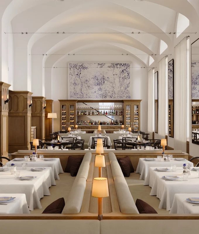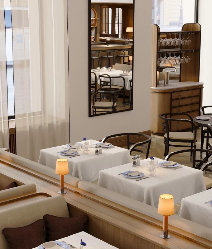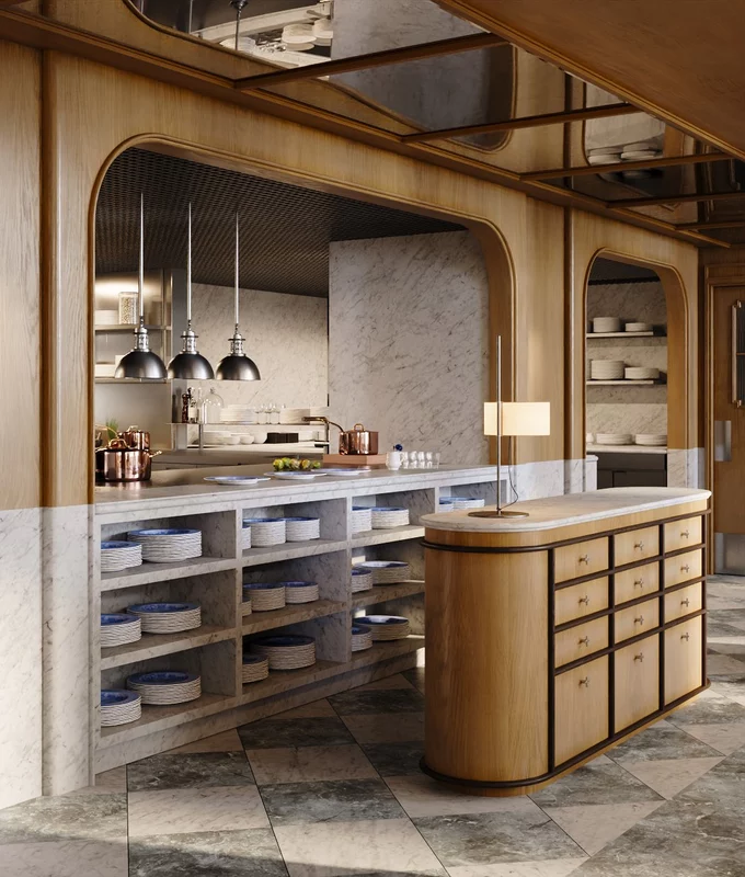 Дизайн делала студия APAA Алексея Пенюка и Анастасии Артемьевой. Внутри просторный зал с семиметровыми потолками, масштабной настенной инсталляцией и мраморными столешницами. Вид из панорамных окон открывается на Петроградскую и Пироговскую набережные и Сампсониевский мост.