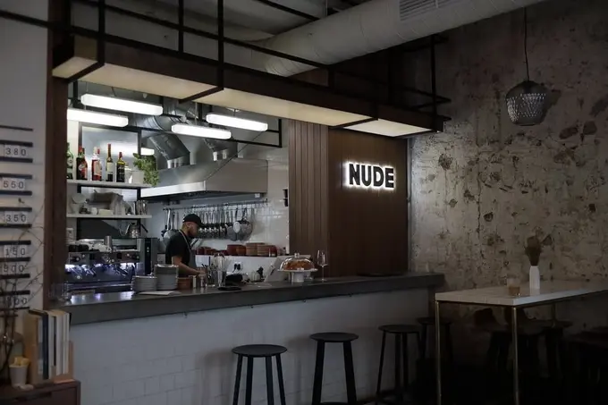 Nude находится в помещении жилого дома 30-х годов. Интерьер разрабатывало бюро Form, внутри — оголенные кирпичные стены, натуральное дерево, бетон, латунные акценты и черно-белая плитка.