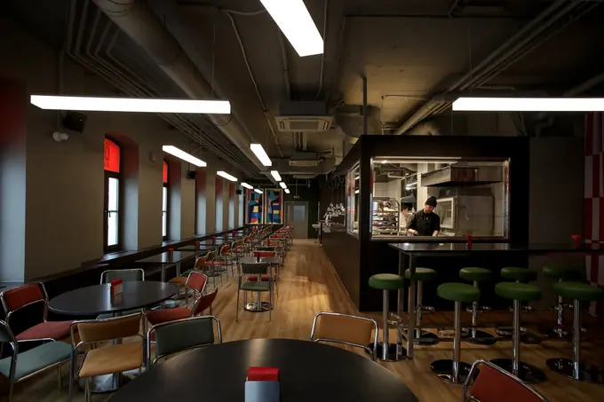 Задачей было создать лаконичный интерьер и наполнить его деталями, подчеркивающими культурный бэкграунд основателей. Новый Öz Kebab встречает гостей длинной барной стойкой, открытой кухней, пекарней, уличным искусством и 90 посадочными местами — чтобы вместить всех желающих.
