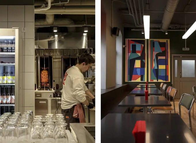 Основа меню, отсылающего к аутентичным кебабным Берлина, сохранилась, но выведена на новый уровень. Мясо теперь готовится на вертикальном гриле. Для этого организован полноценный мясной цех. Кроме того, ребята продумали полноценное помещение для заготовок.