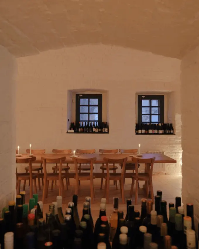 На полках, в холодильниках и на подоконниках бара стоят 340 бутылок вина из карты от Жени Коваленко: 40 вариантов из них разливают по бокалам. В карте есть 10 бутылок Шампани и еще 10 — «Шампани для продвинутых», 30 красных и 30 белых «бургундцев», подборка с границы Жюры и Савойи.
