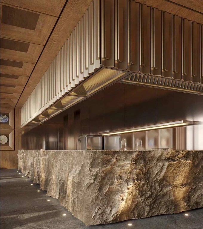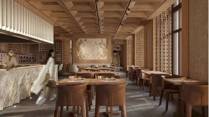 Интерьер разрабатывала студия S+S Studio (Sundukovy Sisters). В оформлении использованы медные оттенки, белое стекло и LED-экраны — как иммерсивное окно в Японию. На стенах будут висеть угольные картины художника Сергея Кузнецова, барельеф Тетсуи Нагаты из рисовой бумаги и фрески в стиле нихонга.