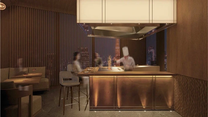 Ресторан занимает два уровня, где на первом расположились главный зал, барная зона и открытая кухня, а также отдельный зал для частных ужинов. Минус первый этаж возносит гостей на руфтоп Токио с иммерсивной панорамой.