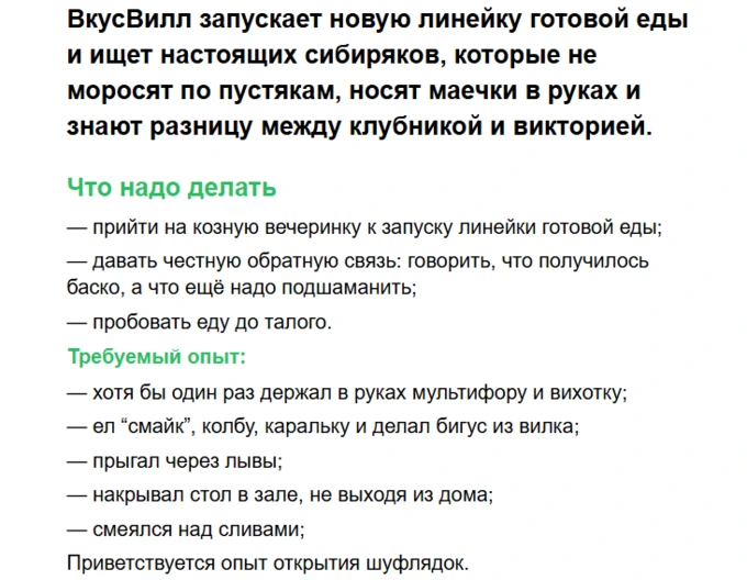 «Вкусвилл» разместил на HeadHunter вакансию для сибиряков: ретейлер ищет дегустаторов для запуска новой сибирской линейки готовых блюд. Задача кандидатов — посетить серию «кОзных» вечеринок в Москве, пробовать новинки и давать честную обратную связь.