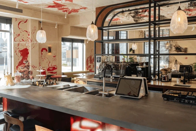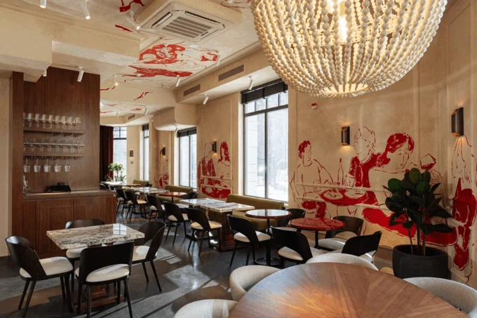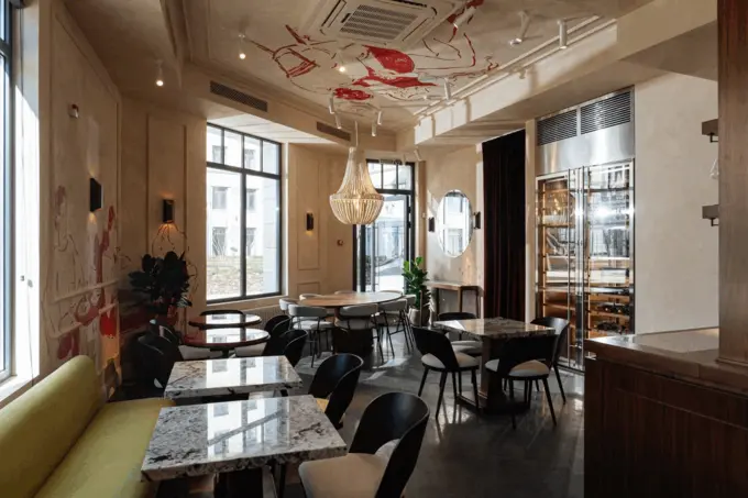 В интерьер добавили теплых тонов и зелени, а на потолке и стенах появилась многофигурная роспись художницы Екатерины Богданковой. В меню планируются завтраки и комфортфуд, гастрономично перекликающийся с винной картой.