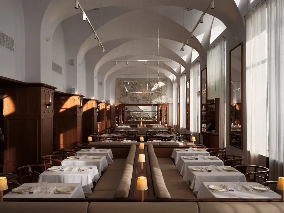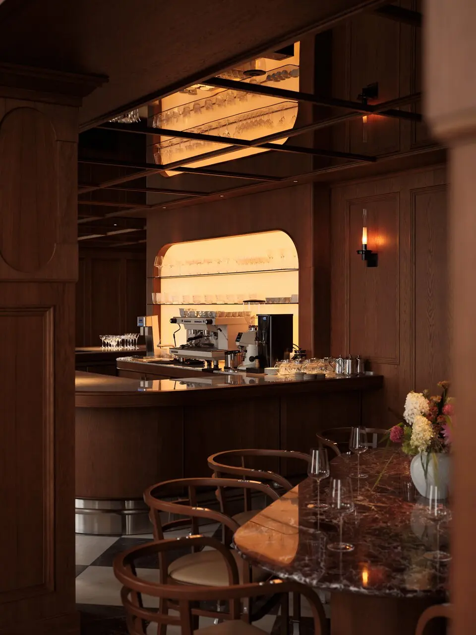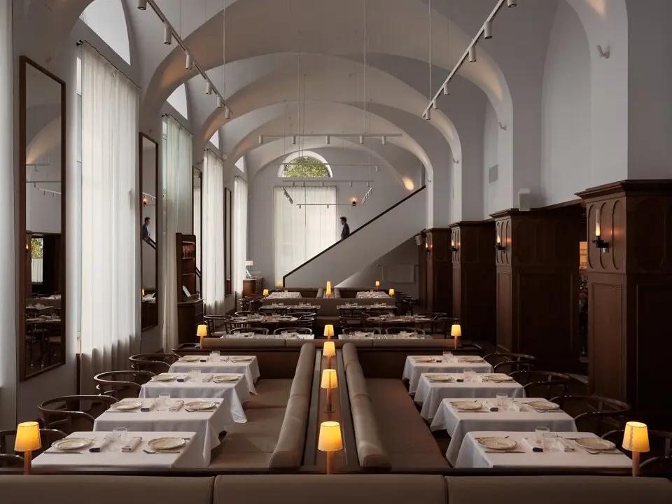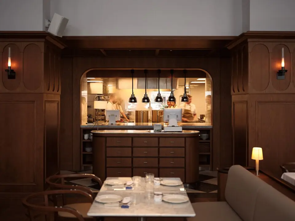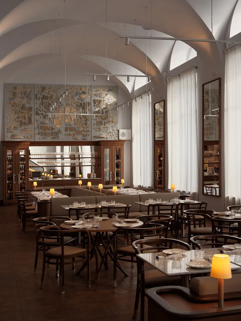 Дизайн в классическом жанре сделали в студии APAA Алексея Пенюка и Анастасии Артемьевой. Во входной группе обустроили контактный бар и лаундж-зону с кожаными диванами и небольшим столиком. Для гостевого зала часть второго этажа демонтировали и сделали сводчатые семиметровые потолки, которые наполняют помещение светом и придают величия. Из необычного — в обстановке нет ни одного живого растения, что добавляет атмосфере серьезности и торжественности. В интерьере выделяются настенные дубовые поверхности и панорамные окна, из которых открывается вид на Петроградскую и Пироговскую набережные и Сампсониевский мост. Торцевую стену под потолком украшает масштабное панно, которое сделала петербургская художница Вера Светлова. Композиция — продолжение проекта «Физика целого»: художница создала керамическую вазу, которую разрушила и собрала заново. Метафора отсылает к понятию «русская кухня»: местами оно забыто, утеряно, границы его размыты, а теперь восстанавливается, пересобирается, обретает новую идентичность.