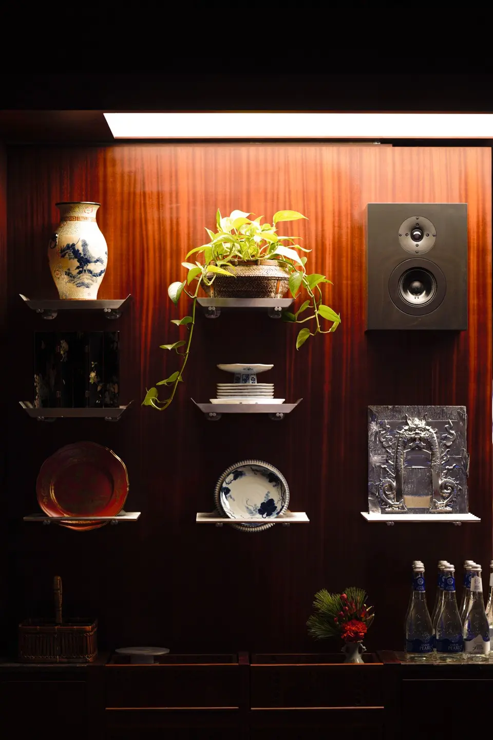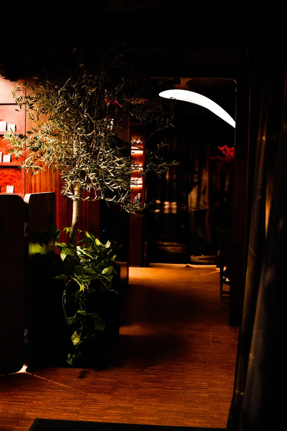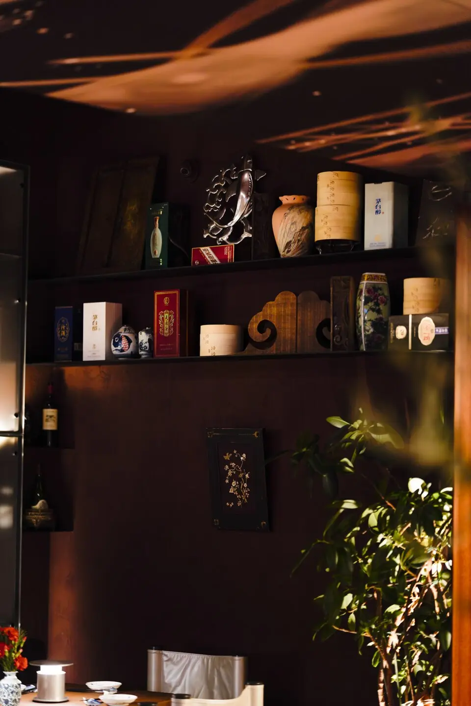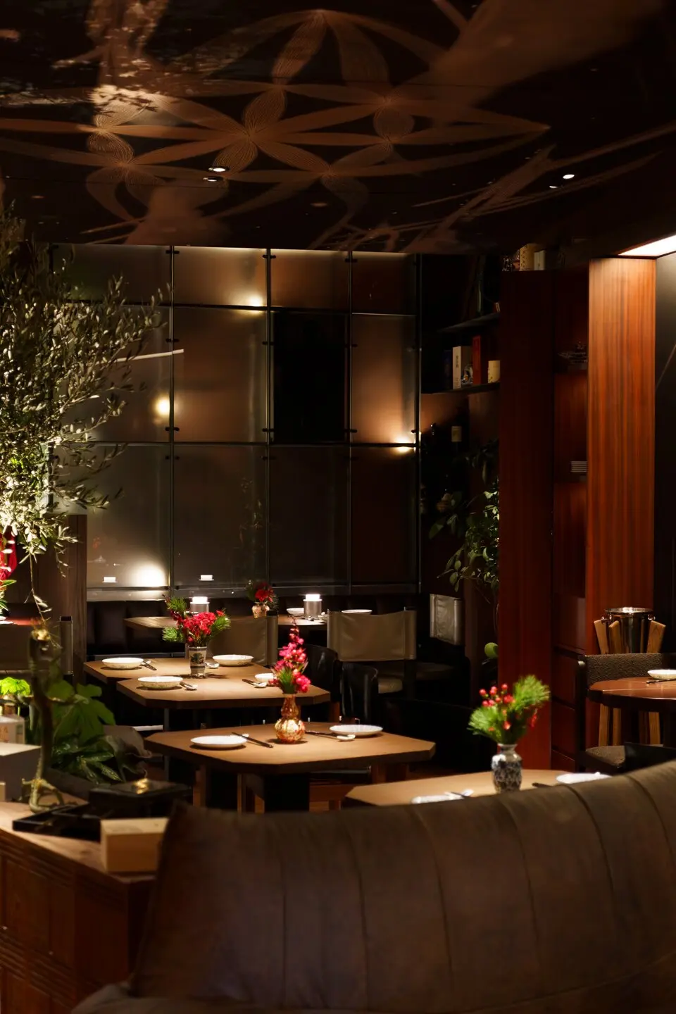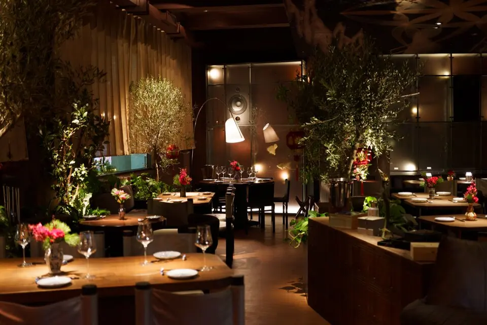 В глубине зала обстановка поспокойнее: здесь организовали классическую посадку, в том числе за маленькими диванчиками. Навесной потолок обтянули тканью с футуристическими изображениями звездного неба. В Self Edge Chinois — нарядно, бойко и очень много зелени. Линии округлые, обтекаемые, без прямых углов. Полки украшены предметами интерьера — от китайских сервировочных тарелочек до нефритовых статуэток, которые в почти промышленных количествах привезли для ресторана из Поднебесной. Антураж дополняют вручную расписанные глиняные вазы, тотемные карпы из папье-маше, деревянные утки и украшенные красными китайскими фонариками оливы.
