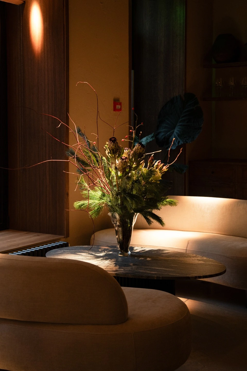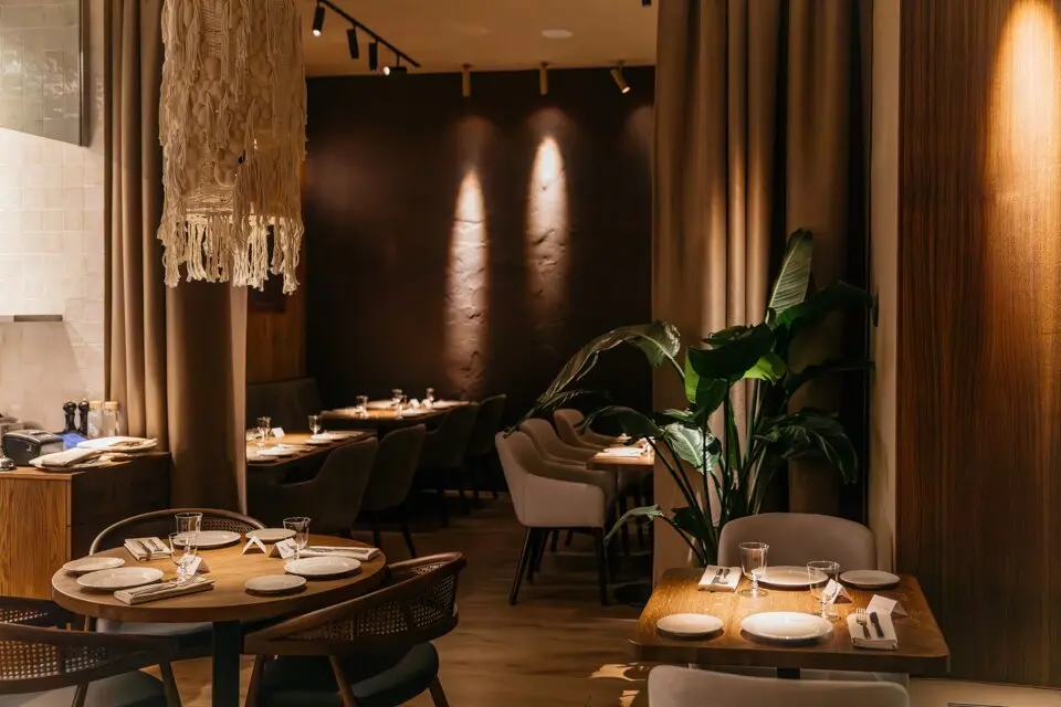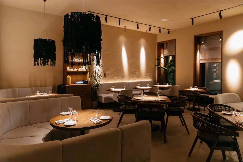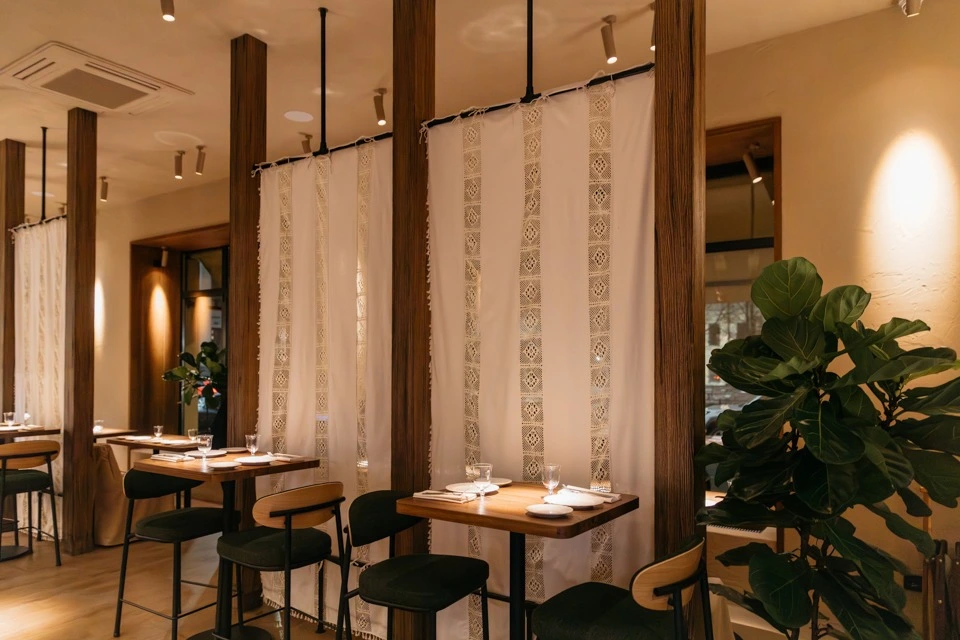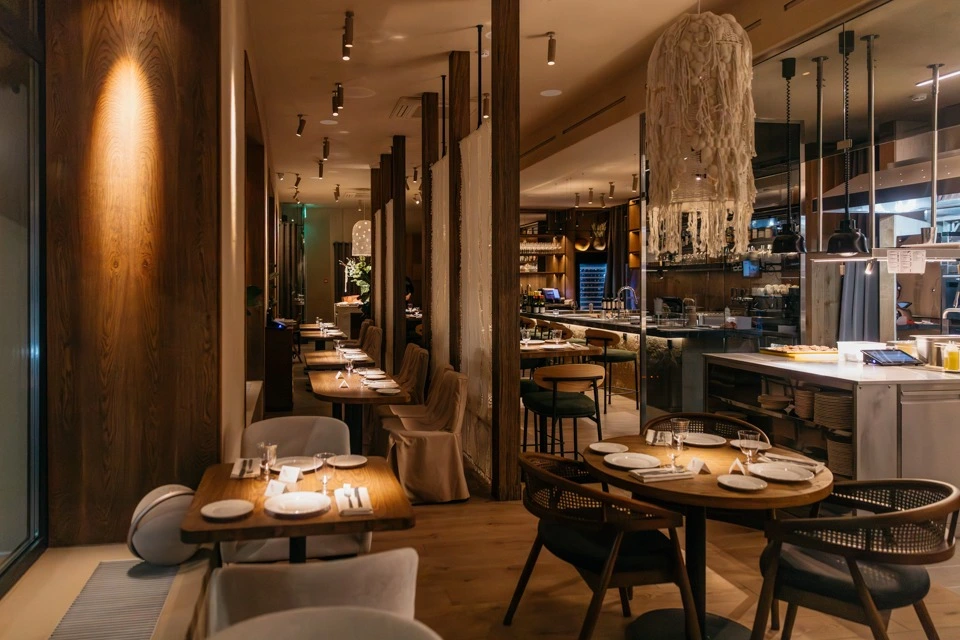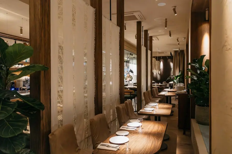 В заведении обустроены разные посадочные зоны — выбирайте! Сидеть можно напротив больших панорамных окон за столиками-двойками — не напротив друг друга, а рядом, как за школьной партой. Можно разместиться у двух открытых станций, где готовят еду, и наблюдать за процессами. Есть отдельный зал в другой части ресторана — с изящными стульями из ротанга, низкими диванами-кушетками, графитовыми столешницами и умиротворяющим видом на внутренний дворик. Рядом расположен отдельный приватный зал на шесть-десять гостей.