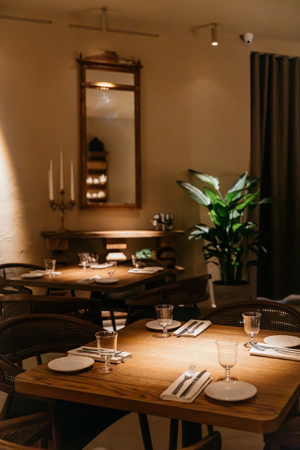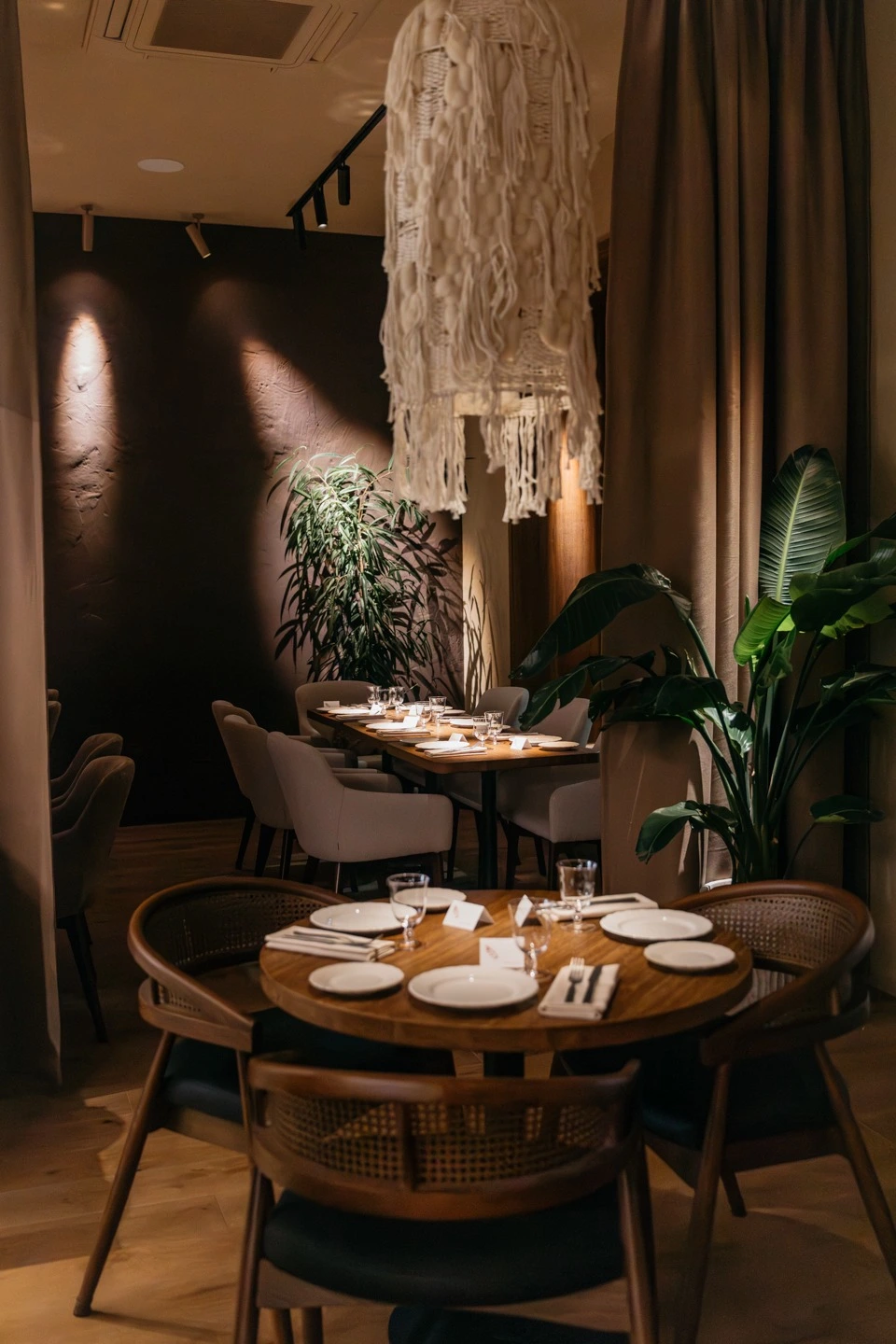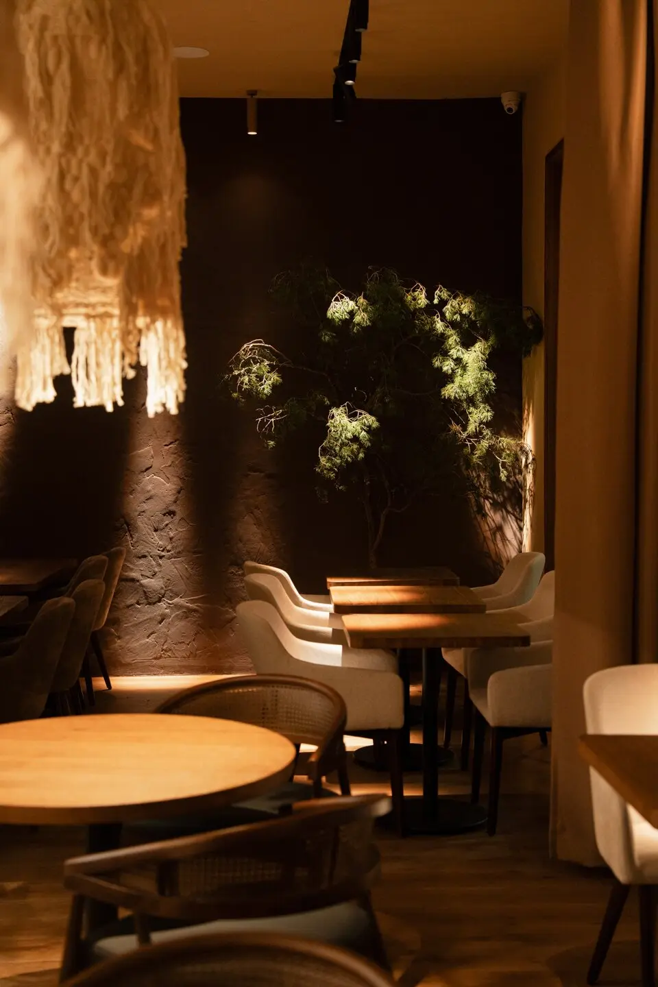 Над дизайном работала Ксения Смирнова (Paloma Cantina, Kira), интерьеры которой особенно замечательны тем, что не похожи один на другой. В «Рябчике» стены грубой штукатурки и массивные деревянные консоли, укутанные в длинные кисти из макраме светильники, зеркала в рамах и тонко выстроенный свет. Все это делает пространство четырех залов стильным и камерным. Чтобы не казаться слишком серьезным, интерьер иногда вам будто подмигивает. Классическую обстановку нет-нет да и нарушит какая-нибудь чудная деталь — оказавшийся на полке пузатый глиняный горшок, древнерусские маски на стенах, огромный, похожий на перевернутую птичью клетку абажур в крупную дырку на входе.
