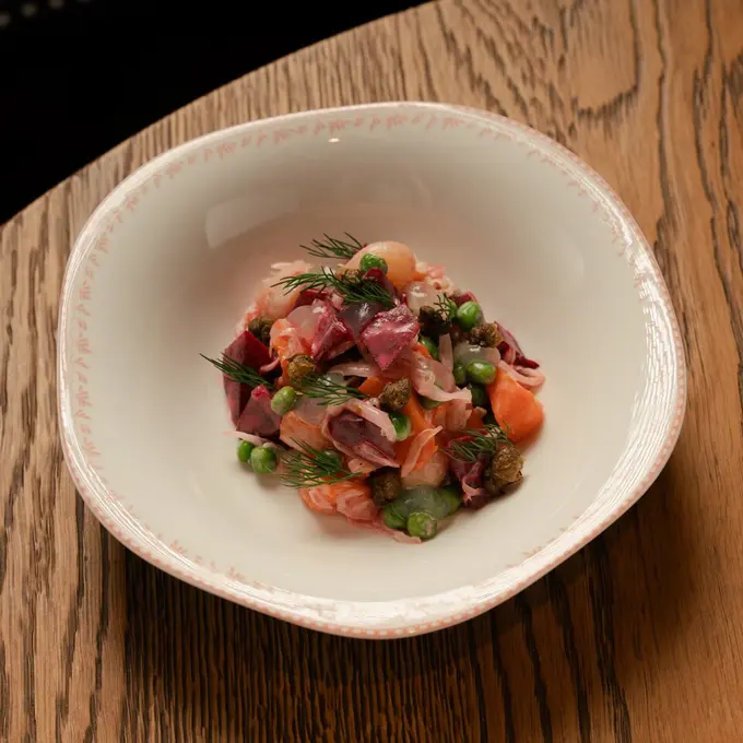 Шеф-повар Роман Найзабеков («Круч», Eclipse) предлагает русскую еду на новый лад. Для начала вам хлебосольно преподносят калач из гречишной муки со взбитым маслом, украшенным натертой икрой кефали, — пока блюдо подают как комплимент. Названия в меню привычные, подачи и вкус нестандартные. На закуску берите размятую с крем-чизом скумбрию — рыбу венчает взбитая с хреном сметана с терпким огуречным релишем, или необычный винегрет — с кусочками маринованной айвы и обжаренными каперсами.