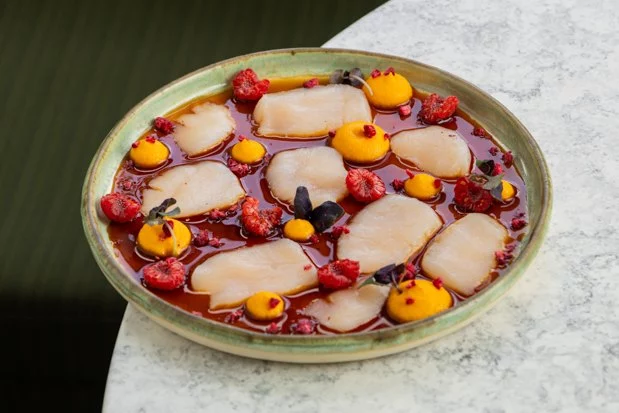 Для фестиваля шеф-повар Артем Мартиросов приготовил три блюда в стиле raw. Для первой закуски он использовал сочетание гребешка с цитрусами и пряным морковным кремом, а вторую сделал сезонной — с черешней и тайским морским виноградом. Самым необычным стало сочетание гребешка с разноцветными томатами и зеленью.