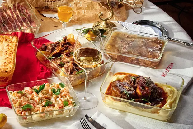 Два вида оливье — с раковыми шейками или уткой, холодец из мяса бычка и пате из куриной печенки, томленного в печи ягненка, оссобуко по рецепту из Ломбардии и лазанью с рагу из мраморной говядины предлагают к предновогоднему заказу в ресторане на набережной Фонтанки. На сладкое — фирменные десерты в формате целых тортов и итальянский панеттоне с земляничным кремом. Выбирать блюда просят до 29 декабря — выдача и доставка действует по 31 декабря.