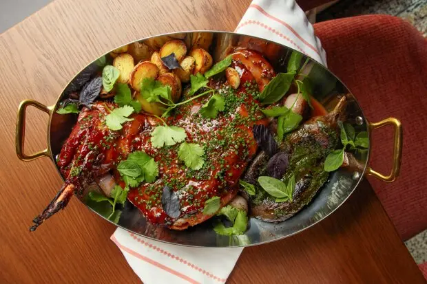 Желающие встретить Новый год с грузинским акцентом — держитесь ближе к ресторану Vakh. Команда подготовила десять праздничных блюд. Среди них мини-хачапури с красной икрой — в формате, которым удобно делиться и украшать праздничный стол, буженина с аджикой и сливовым соусом ткемали, а также рождественская утка, хачапури с козьим сыром и айвой и мимоза с лососем, тунцом и икрой. Целого молочного поросенка тоже приготовят — по специальному запросу. Заказ можно сделать до 30 декабря.