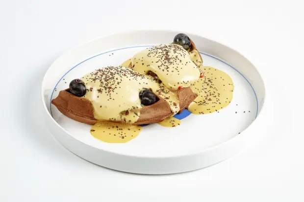 Gaufre — достаточно редкий случай достойного кафе в парке, а именно — в Таганском. Здесь всячески экспериментируют с вафлями и готовят их сытные и сладкие версии с разными начинками. Вот и в меню фестиваля в основном вафли. Нас очень порадовал грузинский завтрак — что-то вроде шакшуки, но с кавказскими специями (осторожно: остро!) и с вафлями. Более классический, но не менее сытный вариант — картофельная вафля бенедикт с беконом. На десерт обязательно нужно разбавить вафельное утро синим (никакого криминала, просто цветки анчана!) баскским чизкейком с кремом из нутеллы.