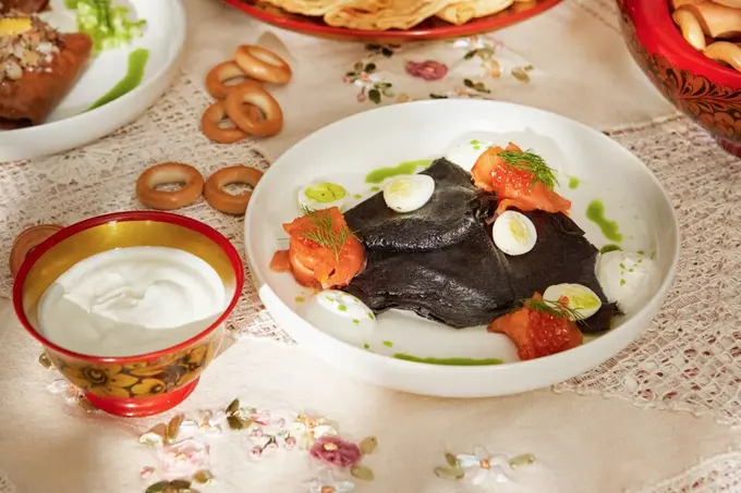 Каждую Масленицу бренд-шеф Станислав Левохо переводит народные традиции на язык гастрономии. Главное предложение в этом году — дюжина блинов на компанию: гостям принесут большой самовар черного чая в сопровождении 12 золотистых блинов, сметаны и домашнего варенья. Также всю масленичную неделю можно заказывать черные блины с копченым лососем и красной икрой, ржаные с муксуном, гречневые с печенью трески, пшеничные с жюльеном из утки и деликатесные — из шпината с мясом краба, яйцом и малосольным огурцом. Юным гостям блины подадут с пломбиром и настоящей палитрой съедобных красок: от нутеллы до ягодных соусов.
