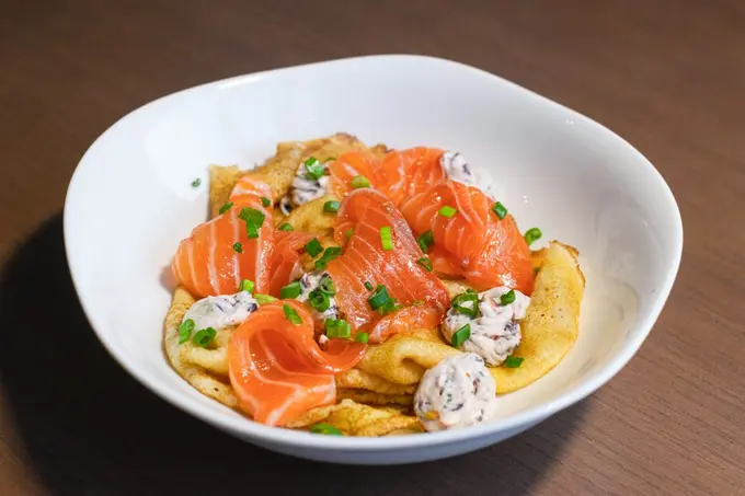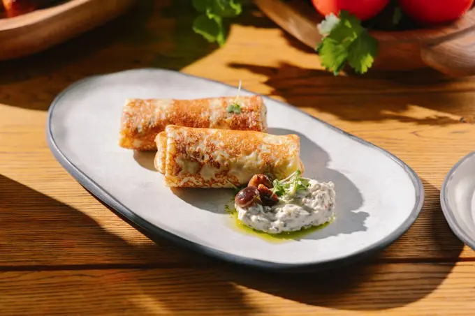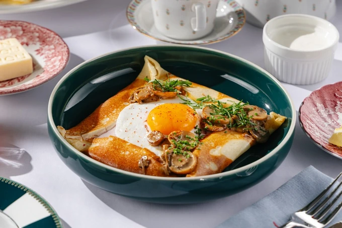 В бистро на Миргородской встречают Масленицу в средиземноморском стиле. В специальном меню от нового шефа Артема Ададимова предлагают четыре варианта блинов: с говяжьим фаршем, томатным соусом и травами, с грибами в сочетании с луком и моцареллой, с форелью и соусом дзадзики и самый домашний вариант — с начинкой из яблок и корицы.