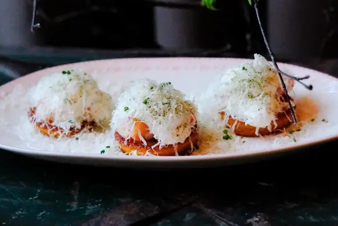 На Масленицу в «Белом рябчике» решили готовить оладьи из печеной тыквы — как дань традиции запасов урожая на зиму, когда корнеплоды хранились в погребах до весны. Предлагают два вида подачи: классическую с красной или щучьей икрой на подушке из сливочного сыра и зелени или в стиле русского фингерфуда — с фалангой камчатского краба, взбитой сметаной и сыром пекорино романо.