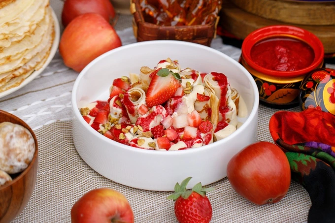 В этом году в пиццерии на Казанской улице повторяют прошлогодний успех: к празднику вновь готовится блинный торт «Тирамису». Блюдо представляет собой тонкие пшеничные блинчики, пропитанные кофейным кремом из сливочного сыра и рома.