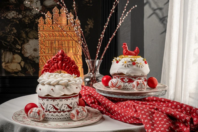Шеф-кондитер Александра Солонина к празднику подготовила куличи с цедрой апельсина и цукатами из вишни и клюквы, вымоченные в апельсиновом соке с коньяком. Один вкус и один русский стиль, но два разных дизайна на выбор: с шоколадным кокошником или курочкой. Оба варианта дополнены десятком яиц с мезенской росписью.