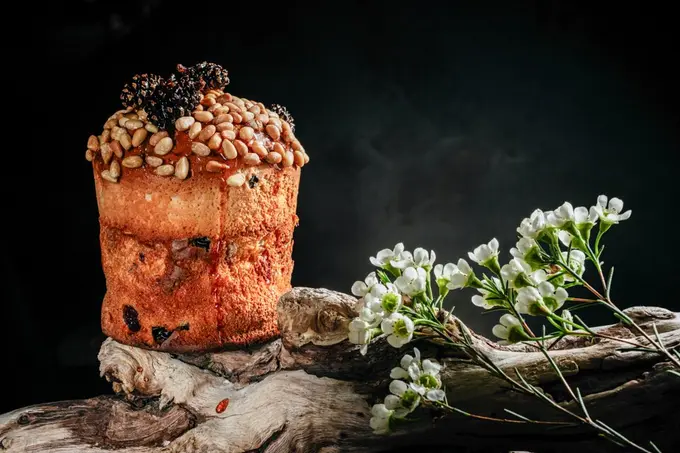 Итальянский панеттоне, но с сибирским характером. Шеф-кондитер Manul Полина Антонова вплетает северные вкусы в праздничный кулич: тесто пропитано таежным медом, внутри — вяленые груша и клюква, а сверху — каленые кедровые орехи и сваренные в сиропе молодые сосновые шишки.