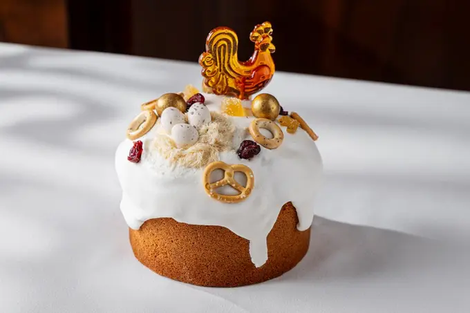 Леденец «Петушок», баранки, шоколадные яйца и цукаты — шапочки куличей от бренд-шефа Владислава Пискунова украшены самыми любимыми сладостями из детства. Сами куличи выпекают с цукатами апельсина и тыквы, изюмом и клюквой, с заварным кремом и ягодным соусом внутри.