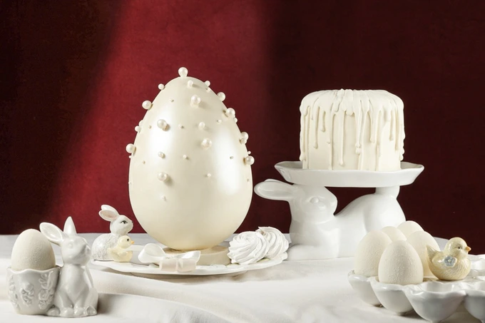 Традиционные пасхальные угощения, но в новом обманчивом облике. Так, например, тающая свеча — кулич с творожным кремом и белым шоколадом; яйца — десерт с «белком» из творожного мусса и «желтком» из манго и маракуйи; большое яйцо, украшенное жемчужинами, — своеобразная сладкая корзинка, внутри которой — ассорти из зефира, печенья и арахисовых конфет.