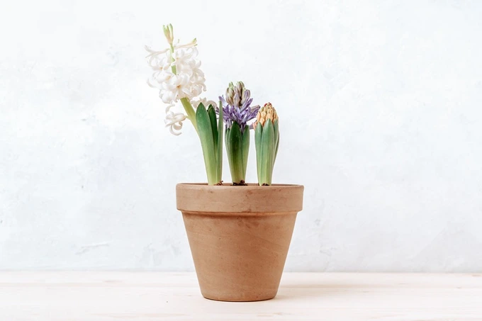 Если хочется цвета, используйте первоцветы: мускари, нарциссы или гиацинты. Их можно поставить на стол прямо в глиняных горшочках. Если горшок выглядит эстетично, его лучше оставить открытым — фактура обожженной глины идеально рифмуется с матовой скорлупой яиц и льном. Если же нужно объединить разные по стилю емкости, их можно обернуть плотной крафтовой бумагой или остатками льна, зафиксировав декор грубой бечевкой.