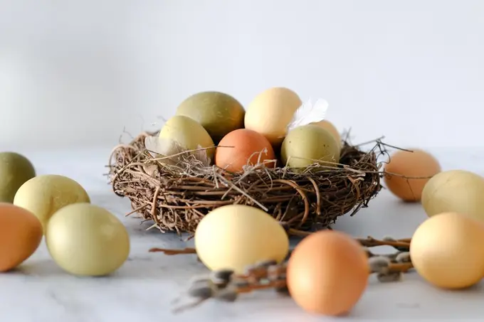 Естественная матовость. Если не натирать скорлупу маслом после окрашивания, она сохранит свою бархатистую текстуру. Эта матовость выглядит очень современно и премиально, особенно в контрасте с блеском металлических столовых приборов.
