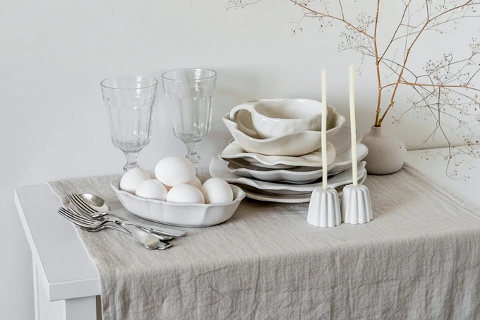 В минималистичной сервировке важна тактильность. Вместо безупречного заводского фарфора с золотой каймой выбирайте керамику ручной работы. Каждая такая тарелка уникальна: где-то глазурь легла чуть иначе, где-то виден отпечаток руки мастера. Эти микродетали делают стол «живым». Такие несовершенства делают сервировку стола на Пасху уютной и лишенной официоза.