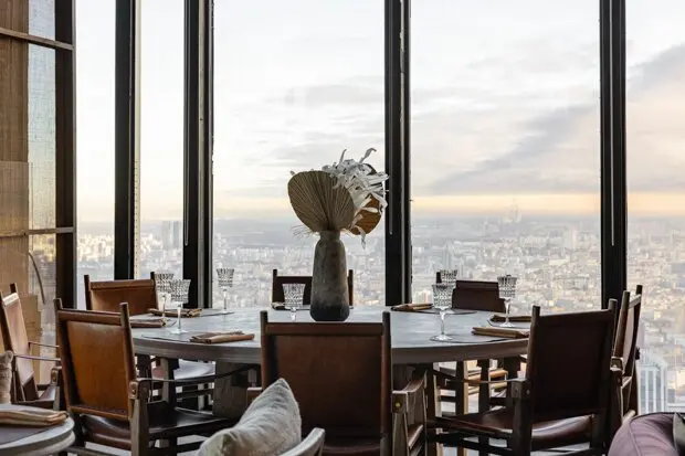 Натуральные материалы, этнические детали, мягкое освещение и панорама на вечернюю Москву создают ощущение оторванности от суеты мегаполиса. Центральным элементом зала стал большой контактный барный стол, расположенный напротив основной стойки. Здесь гости могут общаться с барменами и друг с другом, наблюдая за созданием напитков.