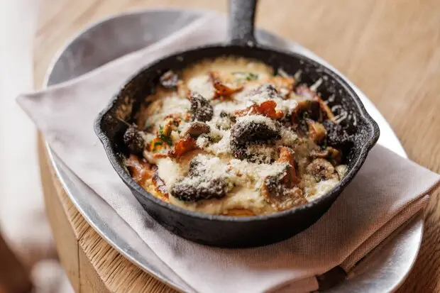 Пельмени по-алтайски с мясом марала, запеченные в грибном соусе с сыром — 950 рублей