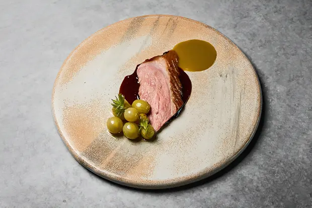 Томленая баранина, приготовленная по принципу русской печи, в соусе из гранатового сока с картофелем конфи, копчеными сливой и виноградом — 1 500 рублей