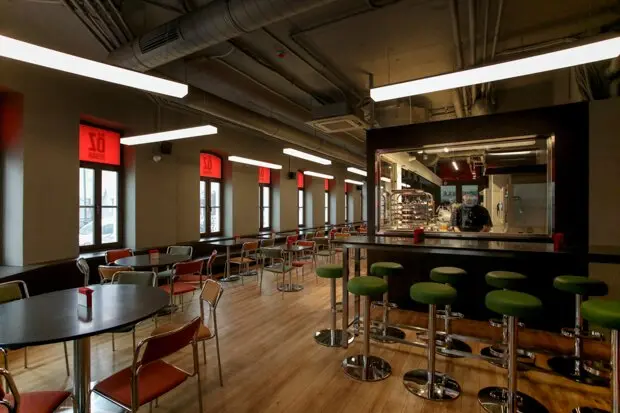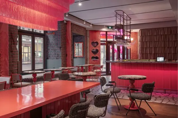 Пространство отражает характер бренда: живой, выразительный и ироничный интерьер построен здесь на контрасте. Каждая деталь — от арт-объектов до элементов отделки — продумана и выполнена вручную. Среди ярких деталей — меховые поверхности и зеркала, на которых гости могут оставлять надписи маркерами. Барные стулья с металлическими каркасами и мягкими сиденьями создают баланс между урбанистическим стилем и эклектикой, а центральный акцент — розовая люстра — сочетает элегантность и дерзость.