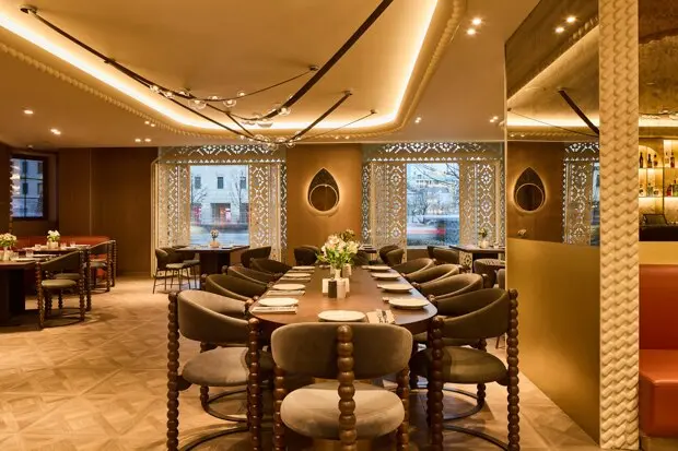 Интерьер заведения сочетает элегантность и фактуру. Дизайн с чистыми линиями, благородными материалами и тонкими акцентами создает атмосферу тепла и гостеприимства, а в центре зала располагается витрина со свежей выпечкой и десертами.