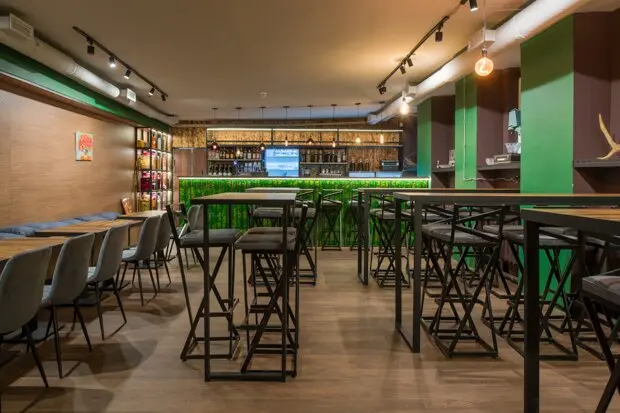 Интерьер рюмочной «Коллеги» на Таганке отчасти вдохновлен предыдущими проектами: обилие натуральных материалов, таких как дерево и мох, а также полноценная картина из атрибутов столичных блошиных рынков и советских коллекций собственников рюмочной в виде хрустальных ваз, чешского сервиза и других неопознанных современным поколением объектов.