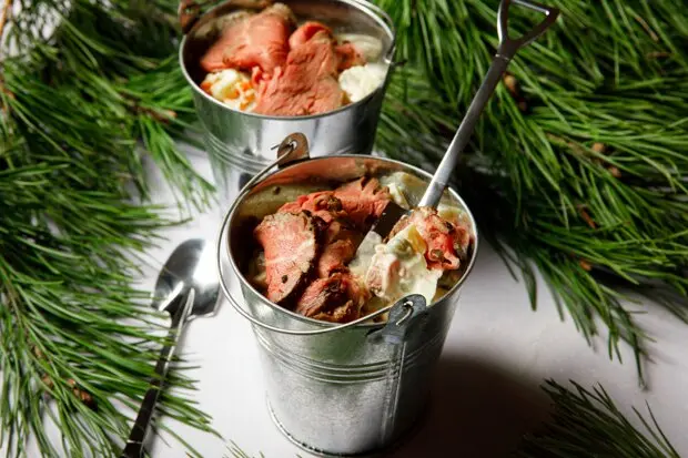 В специальном меню пять блюд, которые сразу хочется снять: вау-эффект гарантирован. Оливье с ростбифом подают в ведре, нарядные наггетсы дополняют легким крем-чизом и двумя видами икры — красной и щучьей, а рождественский «Веллингтон» с белыми грибами — плотным демигласом с добавлением хойсина, который связывает все текстуры.