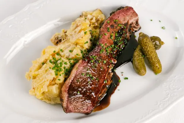 Утиная грудка с кремом из молодой моркови и соусом порто — 1 350 рублей