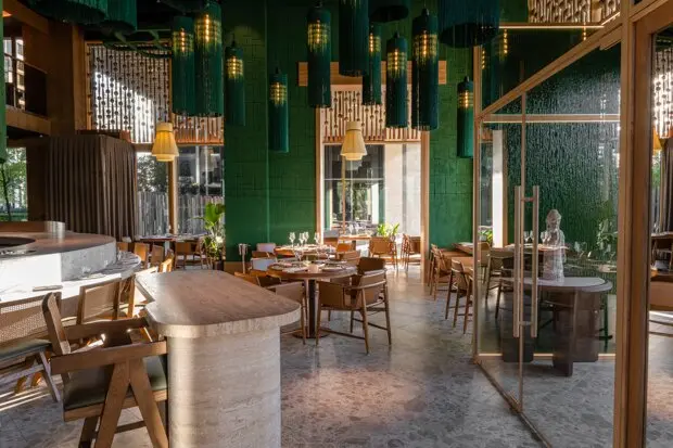 Мария Соколова с командой дизайн-бюро Lichno создала многослойное пространство, где паназиатская кухня обрела свое архитектурное воплощение. Зал ресторана привлекает обилием оттенков зеленого: за панорамными окнами — плотные канаты, изумрудные стены, лианы, перегородки, напоминающие потрескавшиеся скалы, и частицы живой природы, эффектно вписанные в пространство. Сердце «Конга» — открытая кухня с печью и угольным грилем. Вокруг нее образован chef’s table из камня. Рядом — контактный бар. Здесь и просыпается дикая энергия гастрономических джунглей.