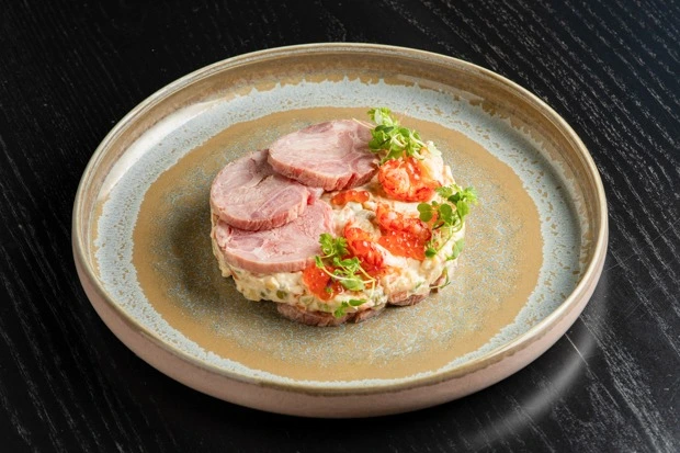 Оливье с копченым рулетом из перепелки и раковыми шейками — 790 рублей