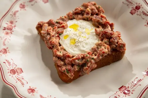 Бриошь с бурратой и тартаром из говядины — 950 рублей