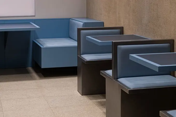 Маленькую бургерную Bumo на улице Жуковского открыл ресторатор Артур Берсиров (Sight). Стильную, в скандинавском духе обстановку создавали в дизайн-студии Adept Works. Здесь два зала — первый с барной стойкой, откуда можно наблюдать за процессом приготовления и сборки бургеров, и дальний с голубыми диванами и белым настенным панно.