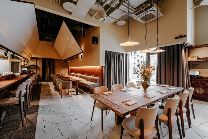 На территории ЖК Lucky открылся камерный японский ресторан Odzu, вдохновленный эстетикой режиссера Ясудзиро Одзу. Пространство объединяет несколько зон посадки, контактный бар и открытую кухню, а одним из ключевых элементов интерьера становятся экраны проектора под потолком — отсылка к эстетике старого японского кино и фильмам Одзу. Полы собраны из разных покрытий — от керамогранита с эффектом кинцуги до мозаики и гальки. Японские мотивы продолжаются в деталях: дождевые цепи, пояса оби для кимоно на спинках стульев, санузлы с атмосферой японских бань и сад камней.