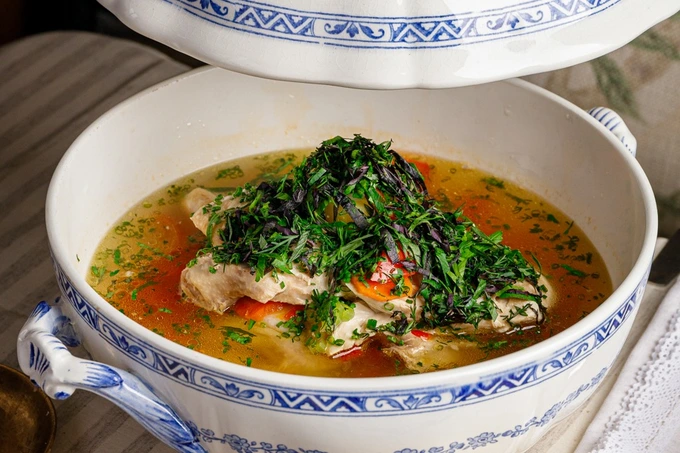 Для блюда используют фермерского петуха, которого томят в печи в насыщенном бульоне с овощами, картофелем, узбекскими томатами и сливочным маслом. Неспешное приготовление позволяет вкусу раскрываться шаг за шагом: бульон становится глубоким и плотным, а мясо — особенно мягким, сочным и выразительным.
