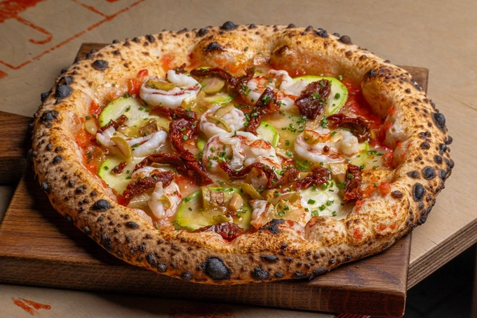 Пицца от Егора Калинина — с лангустинами, цукини, сыром таледжо, вялеными томатами, маринованными оливками, луком-резанцом, медовым чили с трюфелем, томатным соусом с кимчи — 950 рублей