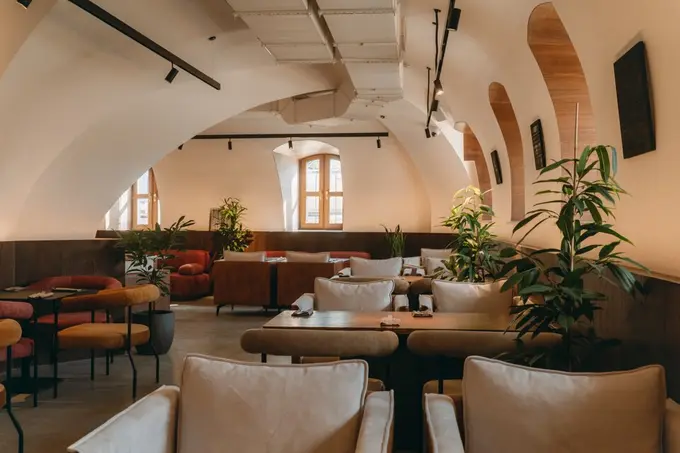 «Своды» находятся в историческом здании, где раньше располагались палаты XVII–XVIII века. Сводчатые потолки — основа всей композиции: пространство вытянуто в длину, и ритм арок ведет взгляд вглубь зала. Белые стены подчеркивают эту архитектуру: без лишнего декора они работают как холст для света и формы. Интерьер фактически построен вокруг холодной гладкости стен и потолков и теплого дерева в отделке и мебели.